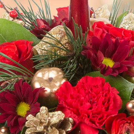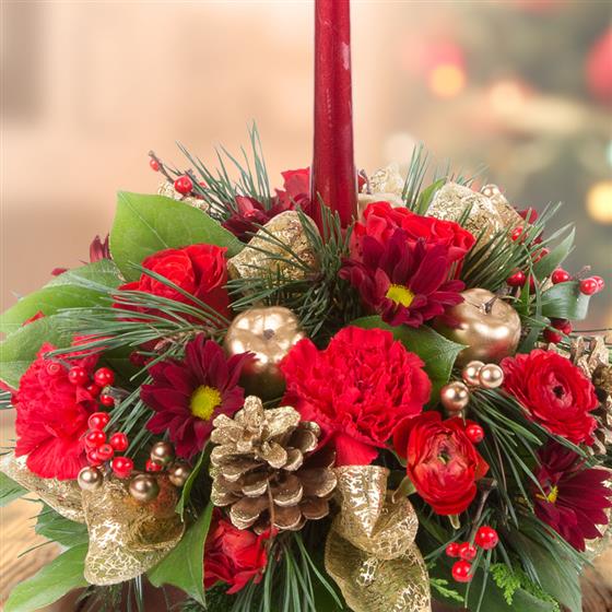A traditional favorite, this spruce arrangement including cones and berries is perfect as a table centre.