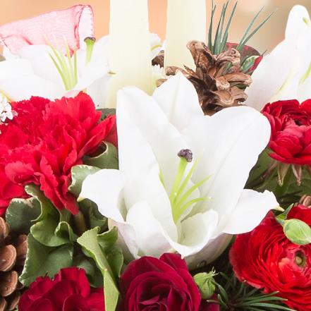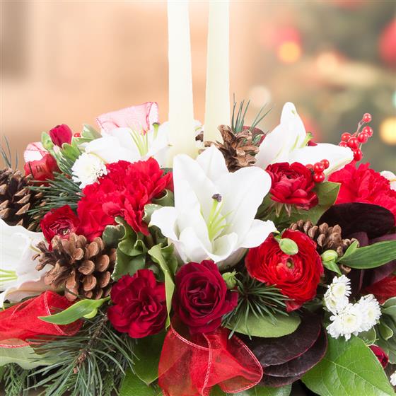A beautiful, traditional table centre. Cones and ribbon give this arrangement a seasonal feel without the sparkle.