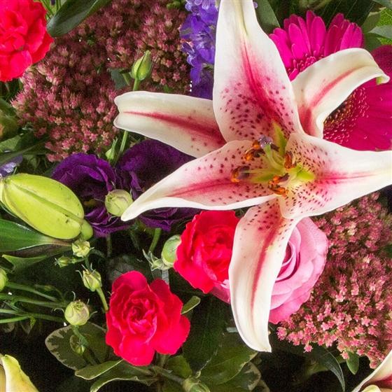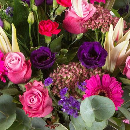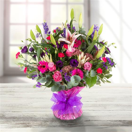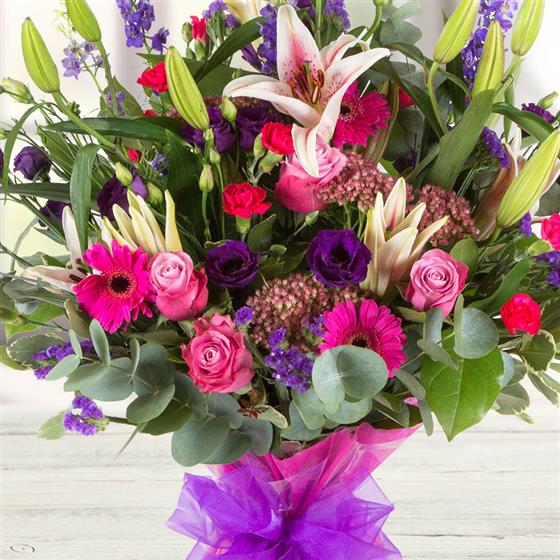 A bold, beautiful bouquet in shades of pink and purple including lilies, roses, and germini. A real show stopper!