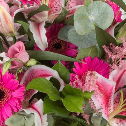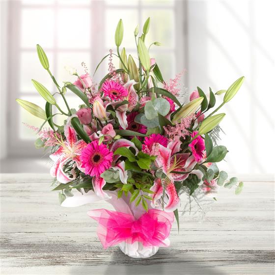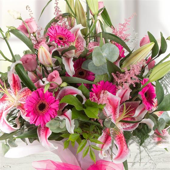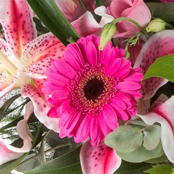 A fun and fabulous display of vibrant pinks including scented oriental lilies and mini gerberas.