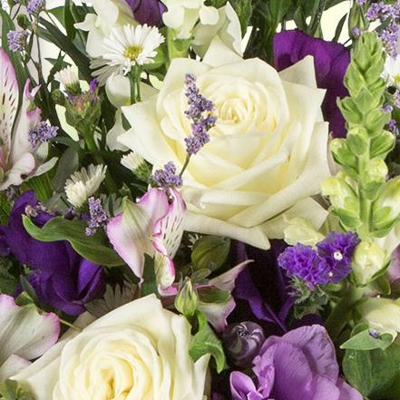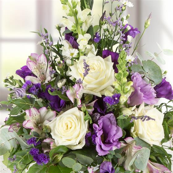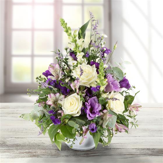 A sweet arrangement in shades of whites, creams, lilacs and purples including roses, september flower, lisianthus and alstromeria.